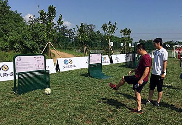 2016年9月20日讯,北京,随着足球运动以神奇速度在群众尤其是校园中展开,场地奇缺、师资匮乏、技术训练难以规范等难题也浮现出来。曾经制造大量健身器材并在北京多个社区惠及于民的“体之杰”近日研制了少儿足球训练器械“足球路径”投入市场。