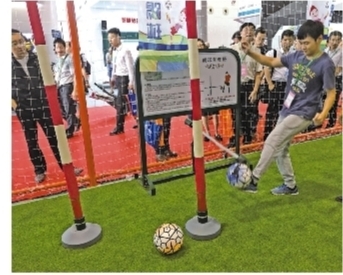 在这种背景下,一批以满足学校足球装备需求的企业应运而生。在这次的装备展上,一家体育用品公司展示的“足球路径”吸人眼球,在现场,不足50平方米的站台内放置了7个训练器,垫球、停球、射门、带球、运球、接球、传球训练器应有尽有。