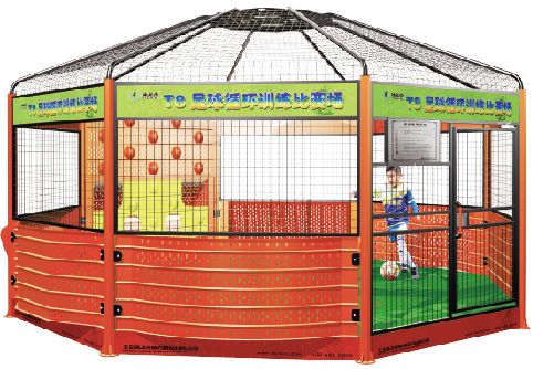 七、弧形反弹板:把球传到弧形反弹板上时,根据足球触碰不同的位置会加快或减慢球速,训练者需根据不同的球速进行向前接球或者原地接球的判断,并利用合理的方式把球接住,提高训练者判断回球速度并做出正确移动的能力。